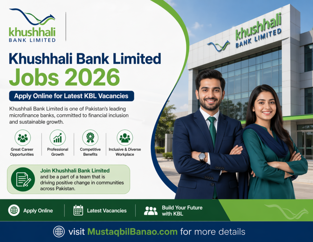 Click on this page for latest Khushhali Bank Limited Jobs 2026 which have been announced by Khushhali Microfinance Bank Limited offering a brilliant chance for talented individuals and inviting applications for multiple positions at its branches to join one of the leading microfinance banking sector. Candidates having interest in KBL Jobs, with relevant educational qualifications and a passion for financial services are strongly encouraged to complete the Online Apply process for KBL careers through MustaqbilBanao.com.